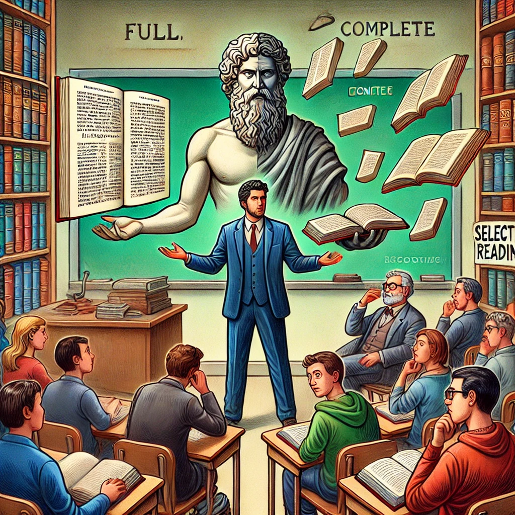Toch is selectief lezen niet altijd problematisch. Wanneer iemand leest voor eigen gebruik, reflectie of inspiratie, is het gerechtvaardigd om passages te kiezen die op dat moment relevant zijn. Maar in de rol van docent is dit anders. Een leraar heeft niet alleen de verantwoordelijkheid om kennis over te dragen, maar ook om recht te doen aan de bronnen waaruit die kennis voortkomt.